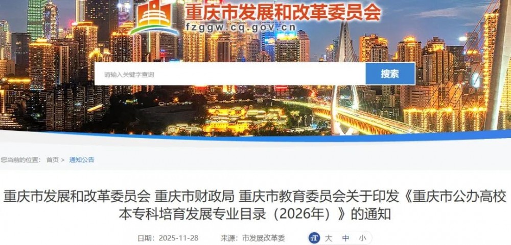 为助推教育强市建设,精准对接重庆市“33618”现代制造业集群体系和“416”科技创新布局,强化人才培养与产业需求的精准匹配,按照《关于优化我市公办高校本专科学费形成机制的通知》(渝发改规范〔2025〕8号)文件要求,市发展改革委会同市财政局、市教委在征求相关行业主管部门意见基础上,制定了《重庆市公办高校本专科培育发展专业目录(2026年)》,现公布如下。